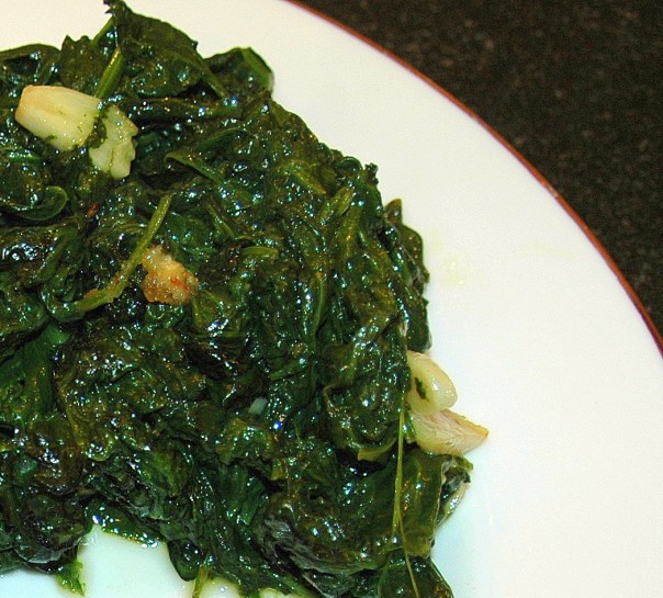 3. Add the spinach leaves, one pound at a time, stir and cover. As the spinach wilts, repeat the process until all of the spinach is cooked. It may be necessary to add some water during this process to help cook the spinach.